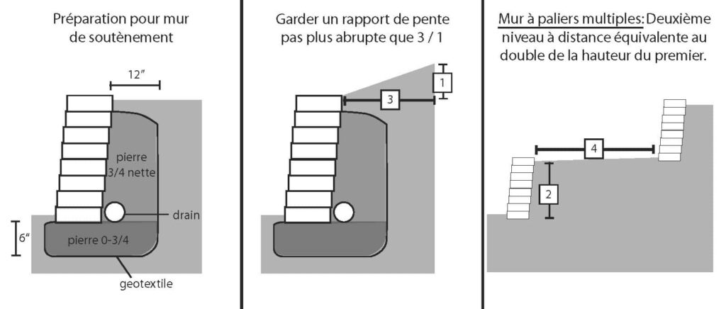 Base Tranchée de 24” de large par 6” de profond de pierre 0-3/4 bien compactée. 10% de la hauteur totale du mur doit être enfouie. Géogrille Pour en maximiser la force, l’installer perpendiculairement au mur, dans le sens du déroulement du rouleau. La largeur du géogrille doit être équivalente à 70% de la hauteur du […]