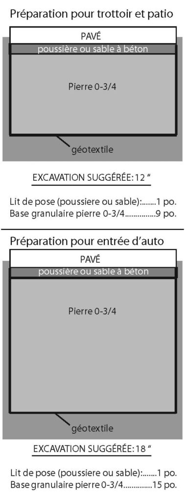 1- EXCAVATION Avant d’excaver, s’assurer de l’absence de conduites ou de fils souterrains. Bien déterminer la surface à aménager. Cela facilite le calcul des matériaux nécessaires à la réalisation du projet. Déborder d’une douzaine de pouces afin d’assurer la stabilité des bordures et pavés. Excaver de manière à obtenir une pente de 2% (1/4” par […]